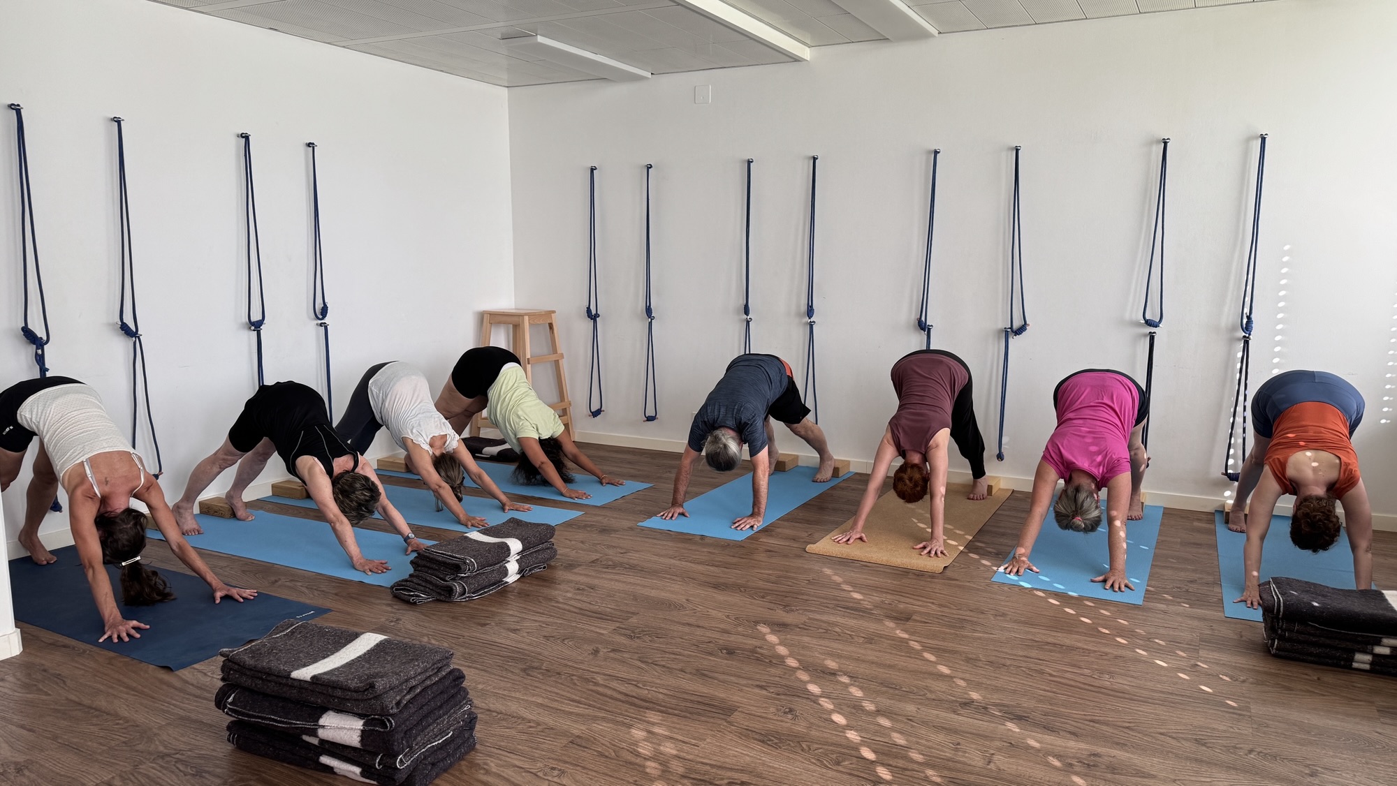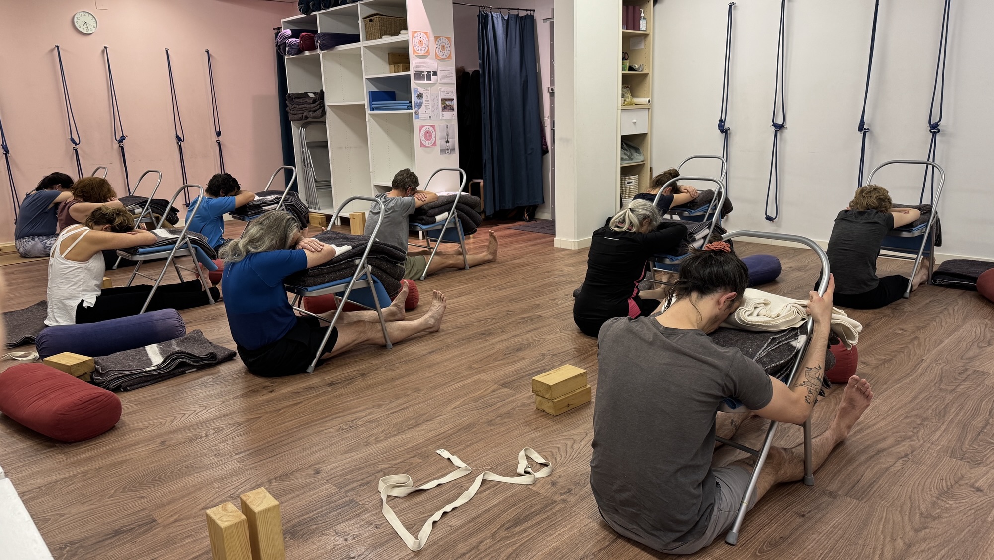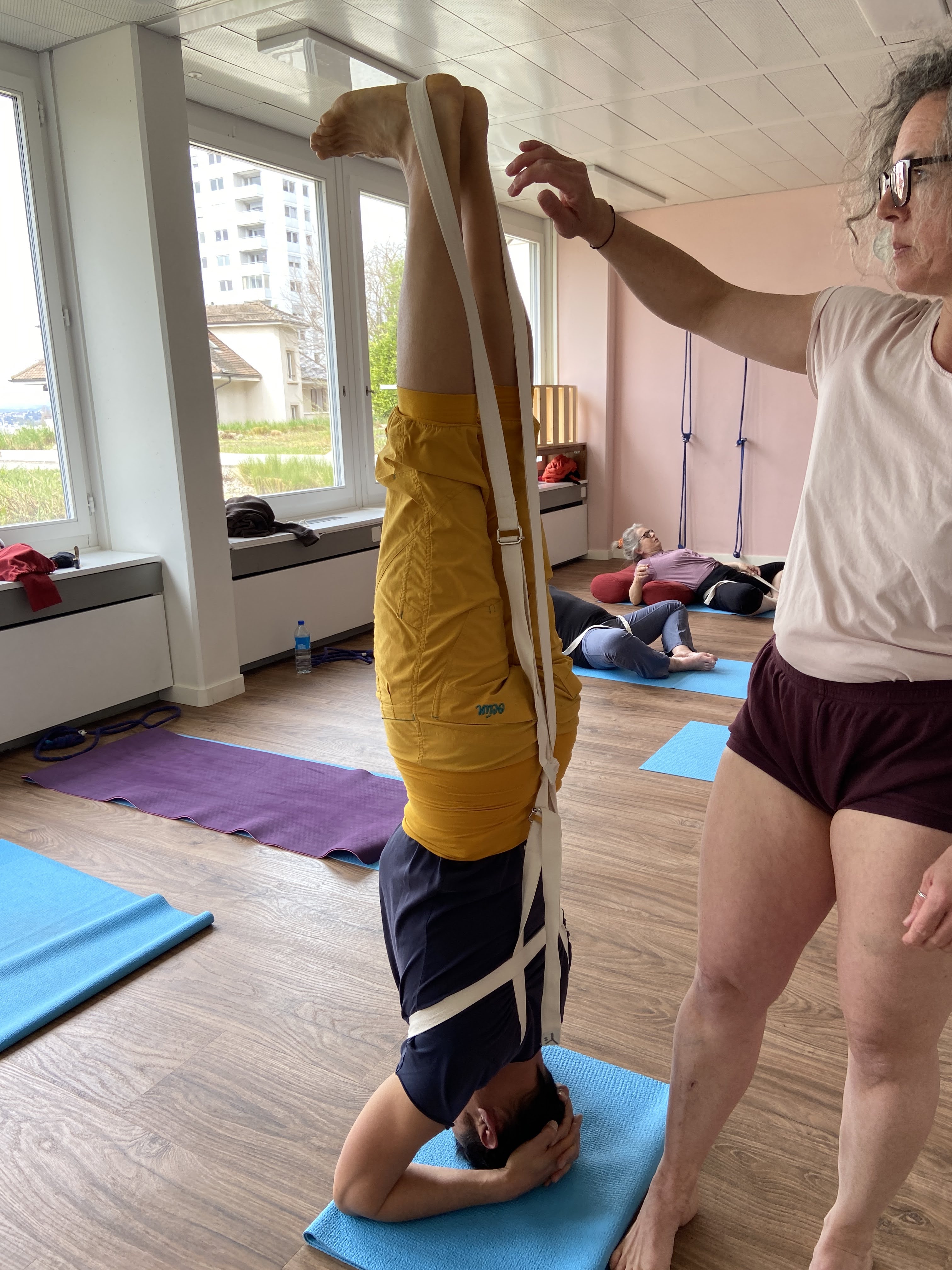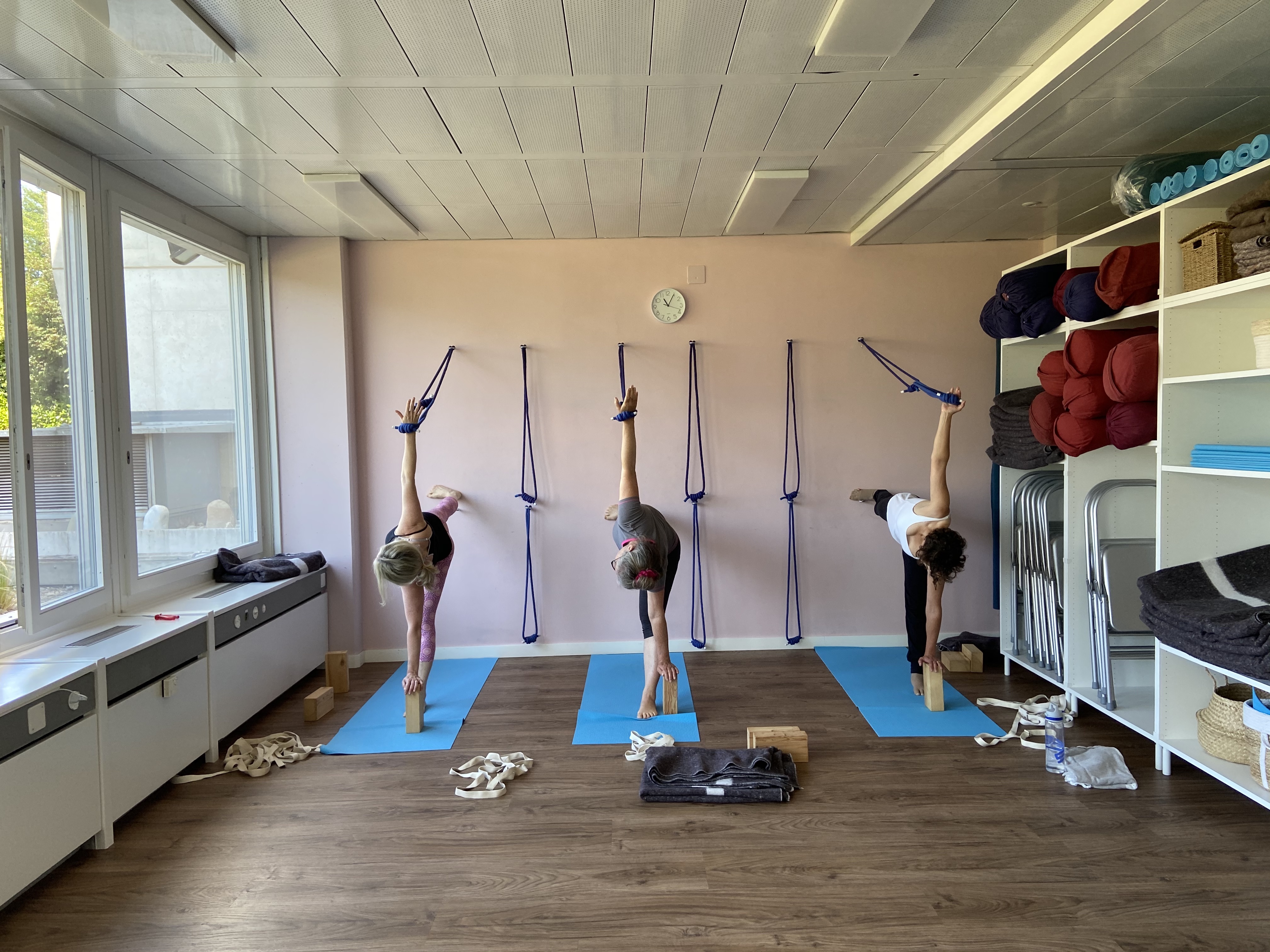 Les cours adultes se donnent en petits groupes et l’enseignante guide les élèves par des indications précises sur la manière de travailler dans les postures, qui varient de semaine en semaine. Le cours détente du jeudi à 17h travaille surtout l’ouverture de la poitrine, des épaules et des hanches avec des supports et en maintenant les postures plus longtemps.