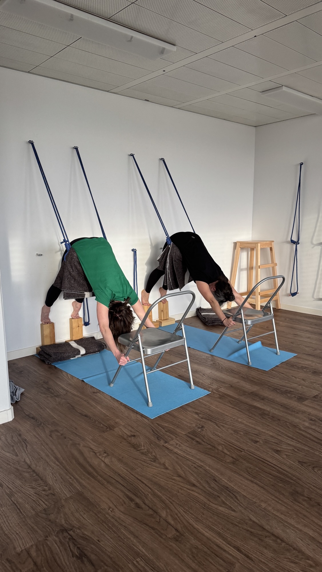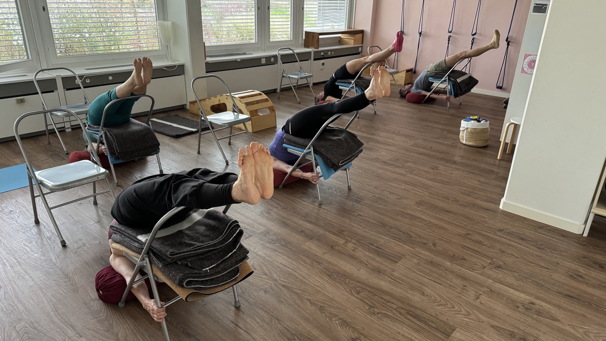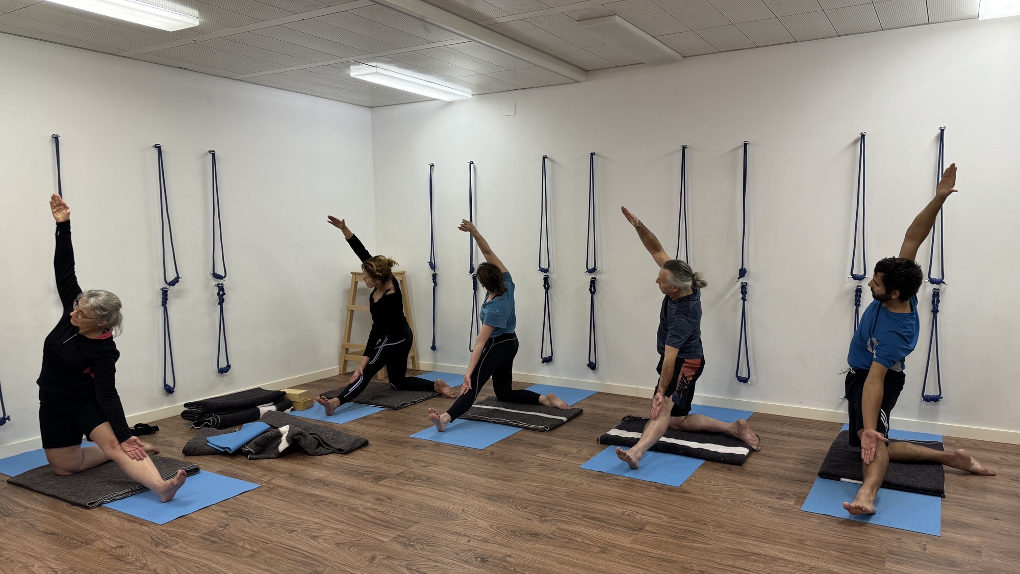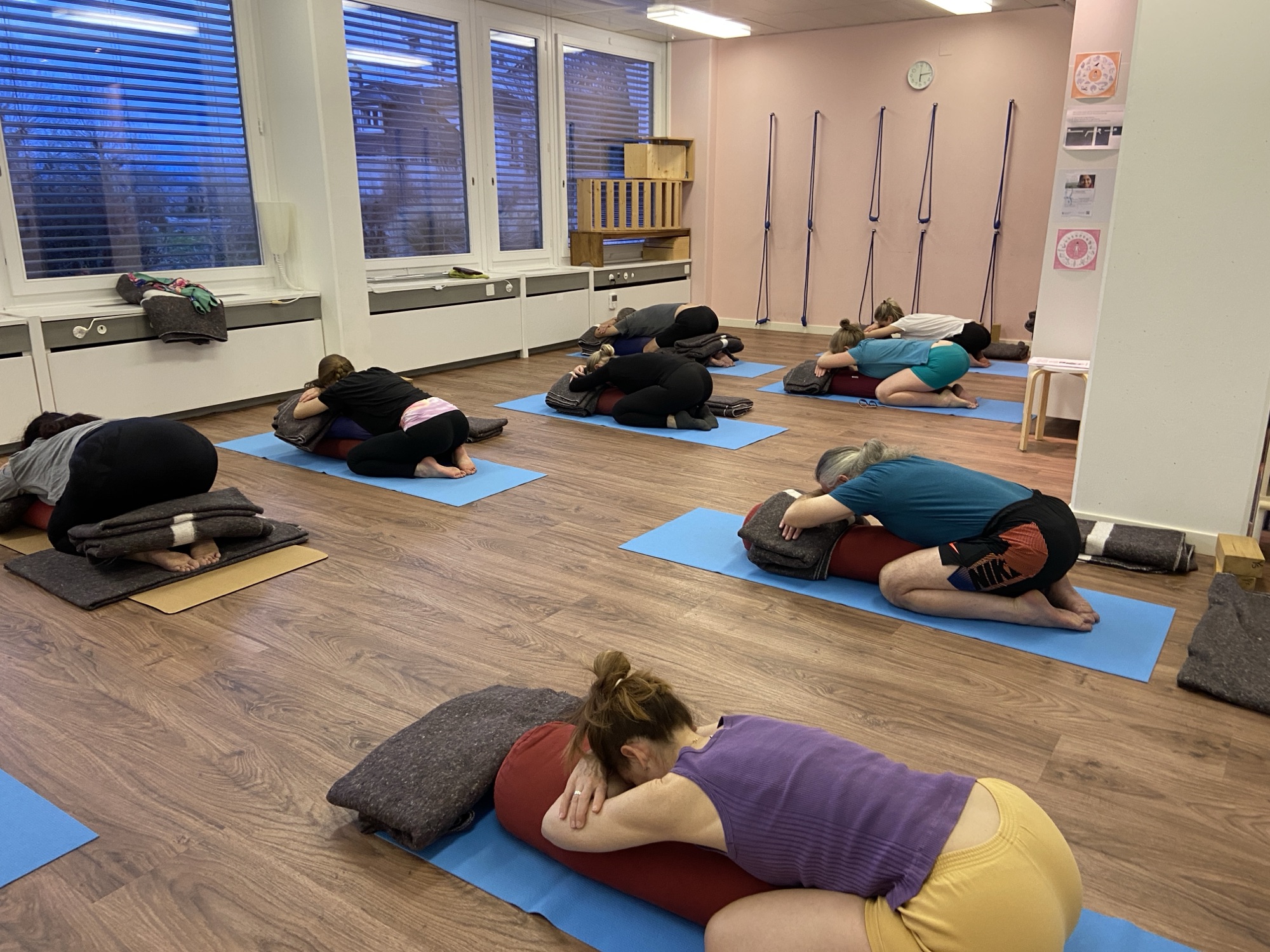 Les cours adultes se donnent en petits groupes et l’enseignante guide les élèves par des indications précises sur la manière de travailler dans les postures, qui varient de semaine en semaine. Le cours détente du jeudi à 17h travaille surtout l’ouverture de la poitrine, des épaules et des hanches avec des supports et en maintenant les postures plus longtemps.