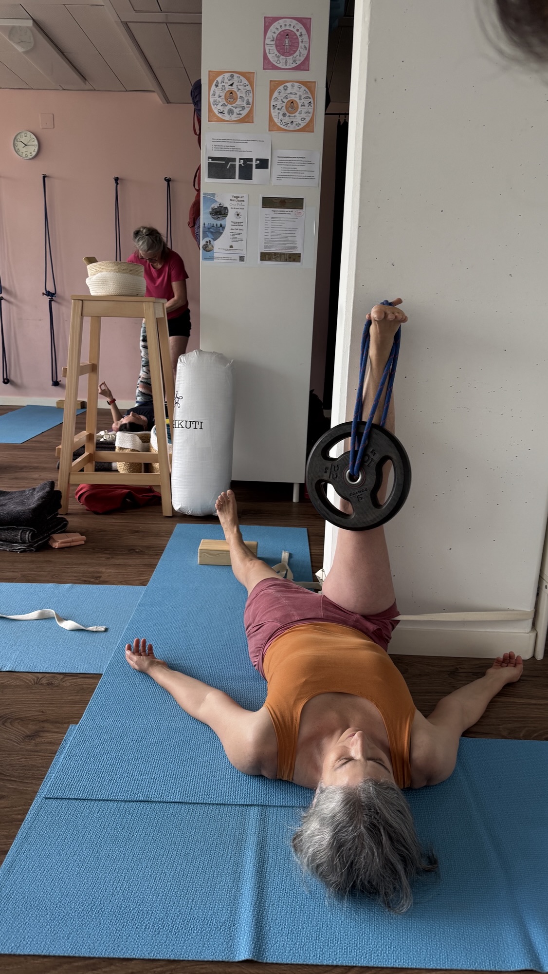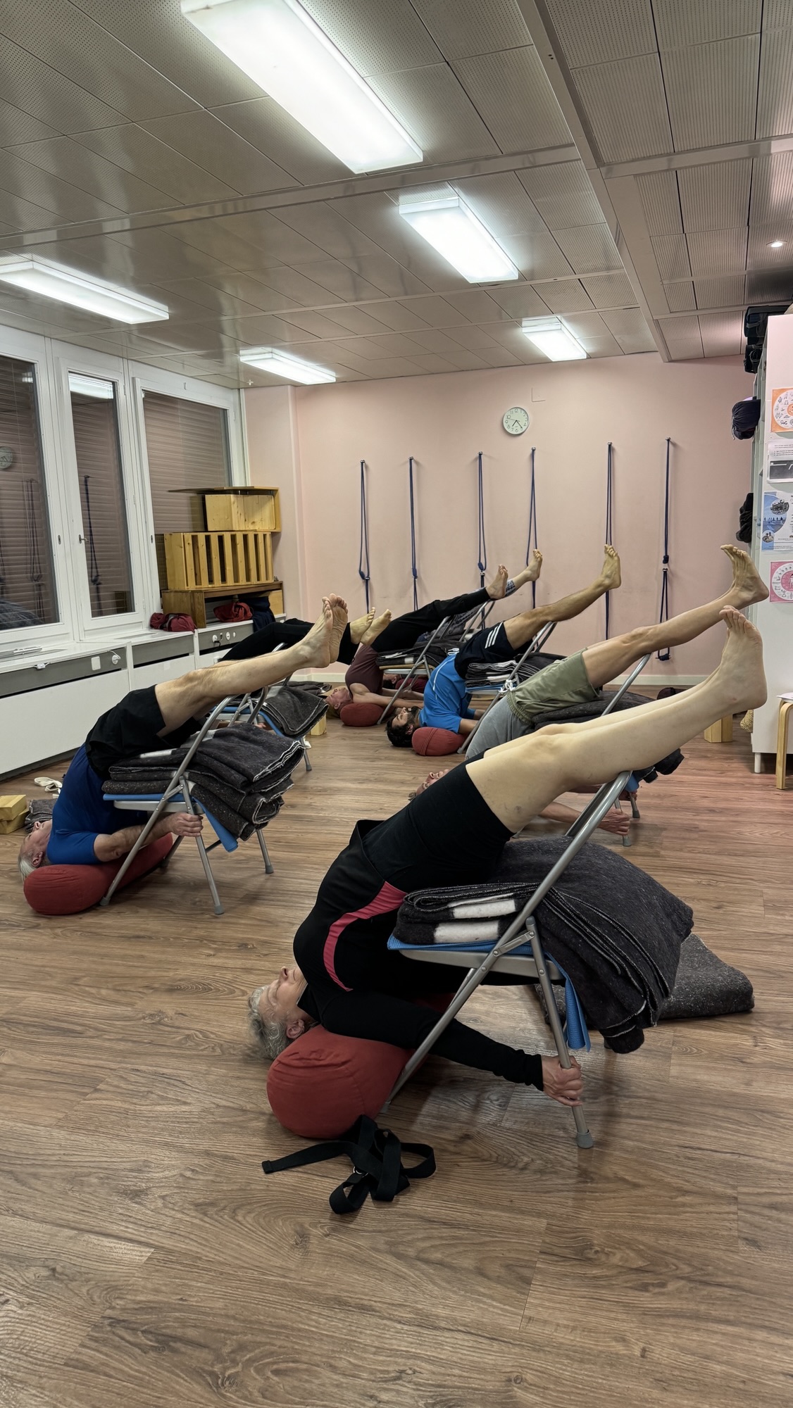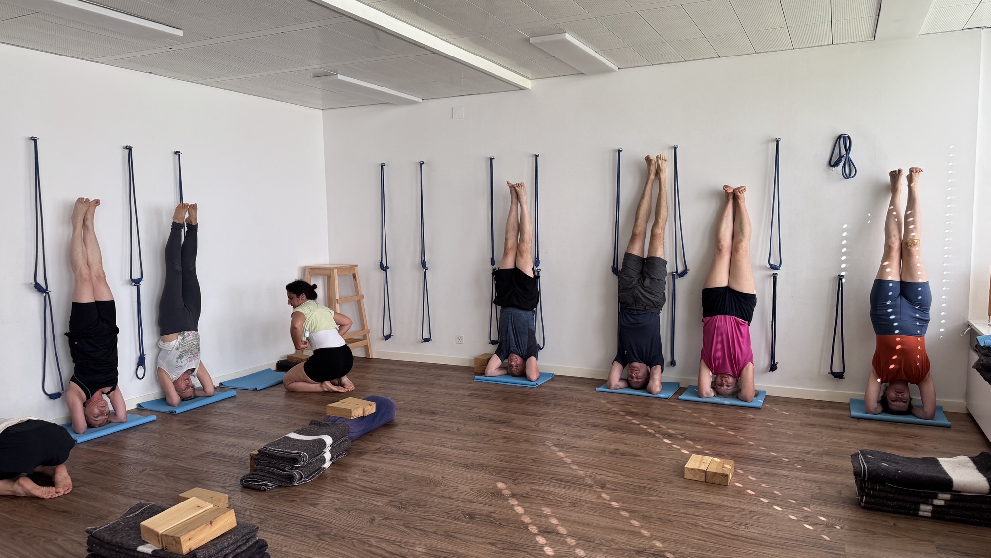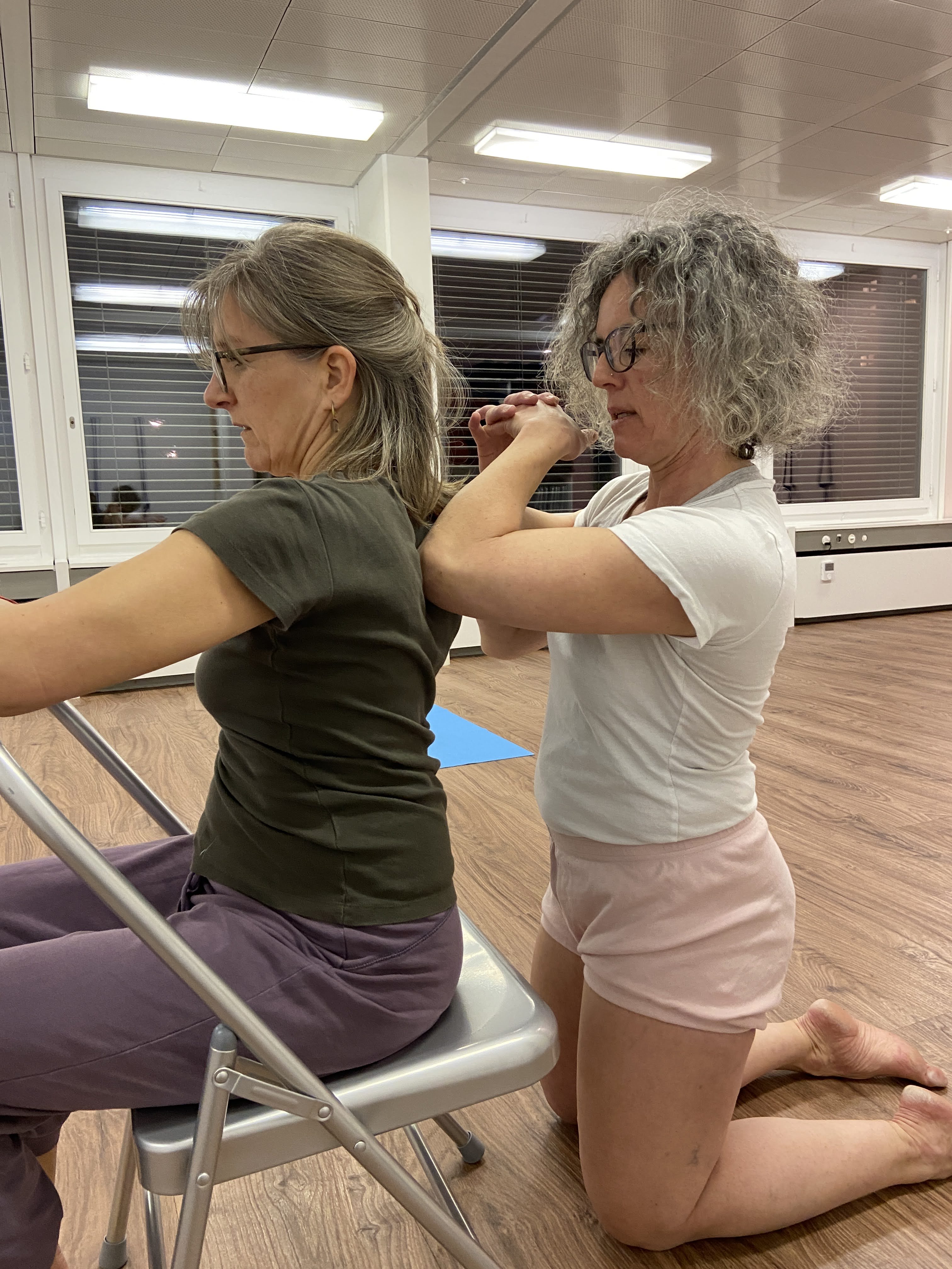 Les cours adultes se donnent en petits groupes et l’enseignante guide les élèves par des indications précises sur la manière de travailler dans les postures, qui varient de semaine en semaine. Le cours détente du jeudi à 17h travaille surtout l’ouverture de la poitrine, des épaules et des hanches avec des supports et en maintenant les postures plus longtemps.