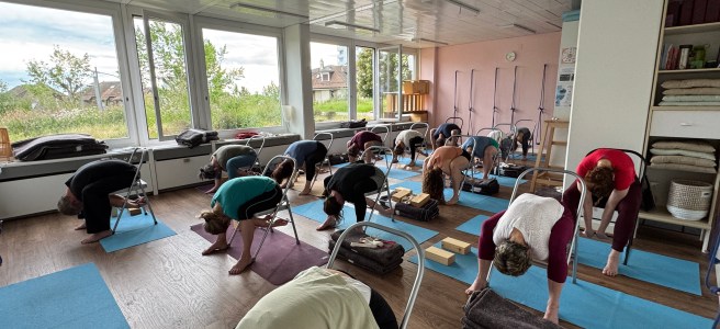 Les cours adultes se donnent en petits groupes et l’enseignante guide les élèves par des indications précises sur la manière de travailler dans les postures, qui varient de semaine en semaine. Le cours détente du jeudi à 17h travaille surtout l’ouverture de la poitrine, des épaules et des hanches avec des supports et en maintenant les postures plus longtemps.